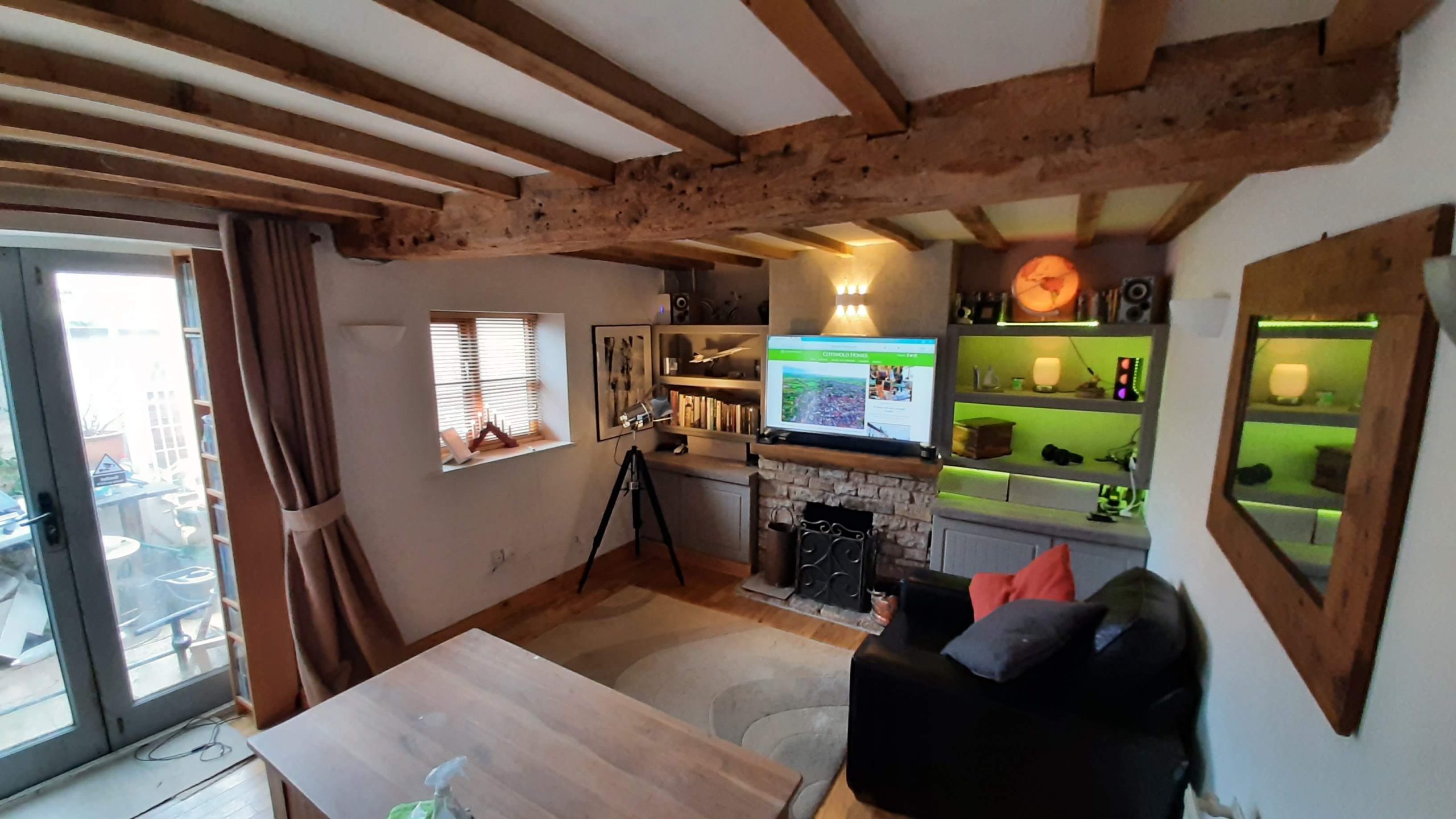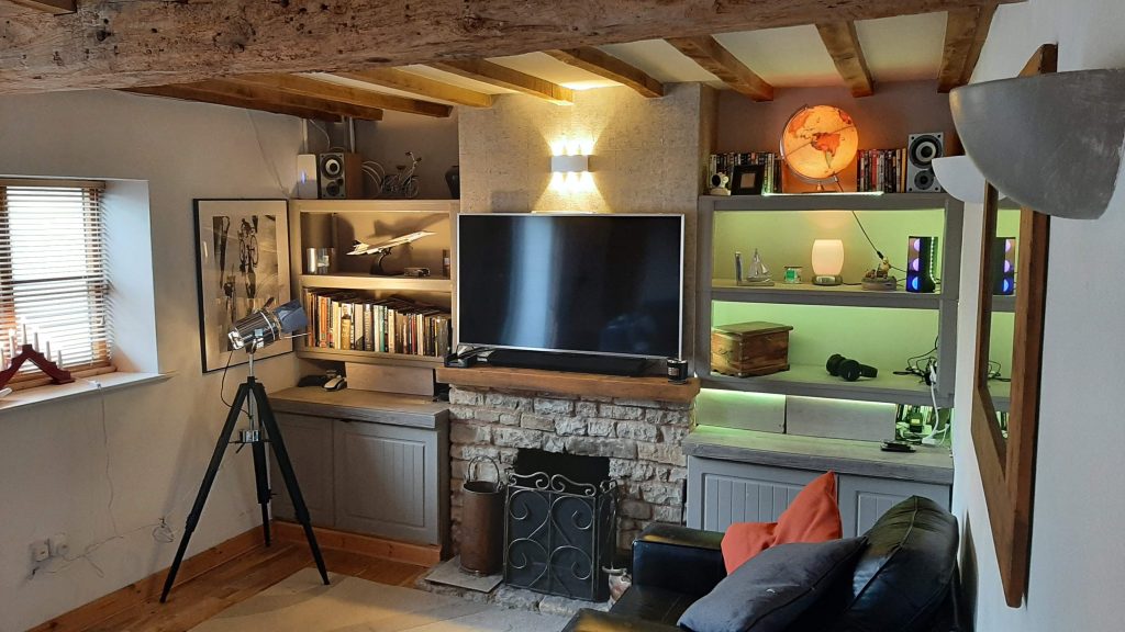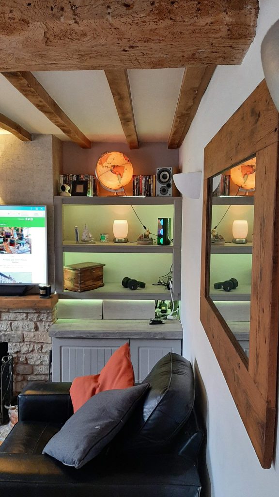 Lounge 15.5′ x 11′ with window to the front and two glazed French doors leading onto a terrace.Attractive open fireplace with stone surround and half polished timber handles display shelving to either side enclosed shelving and cupboards area inbuilt. Solid permanent oak flooring bonded to concrete. Fine exposed ceiling timbers and dimmer control light switch for wall lighting