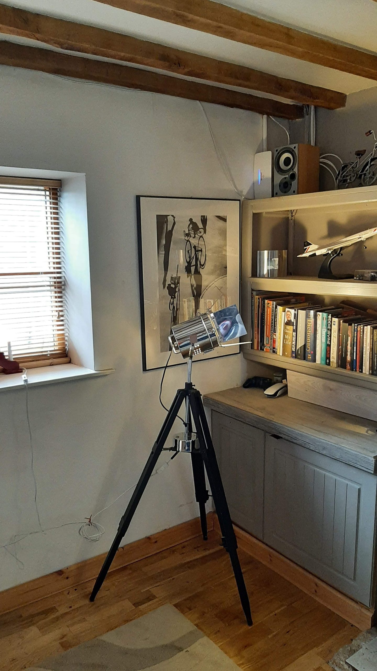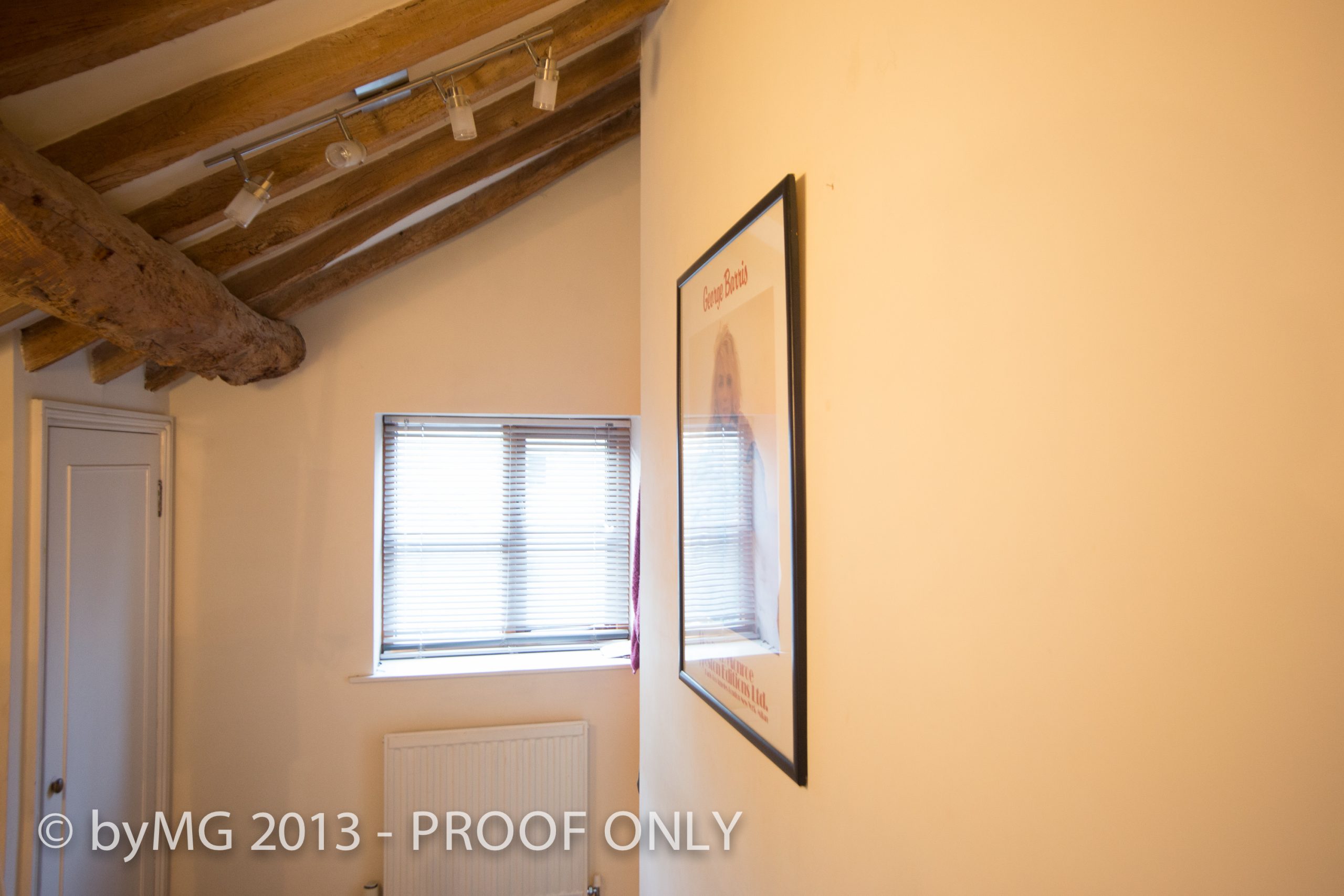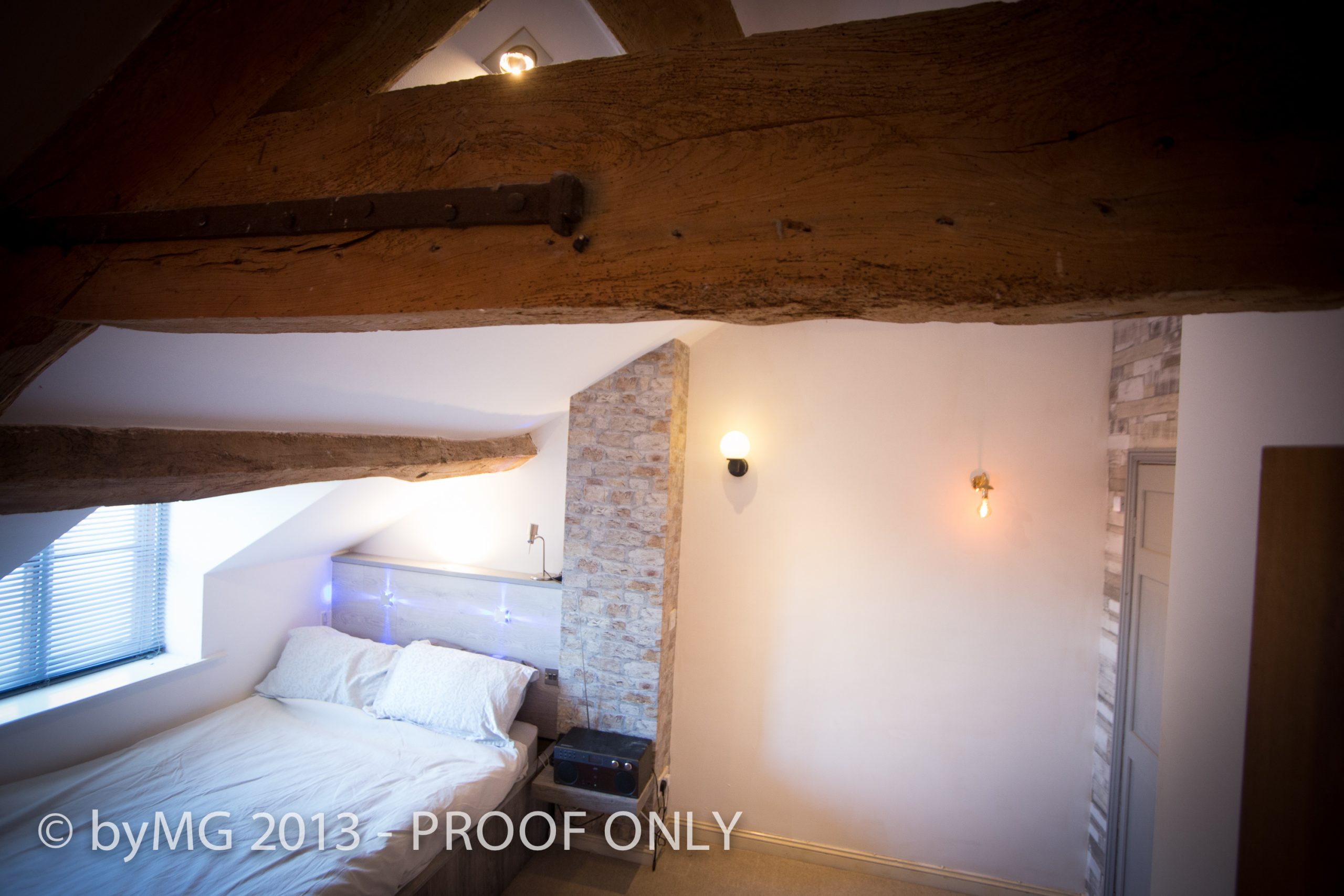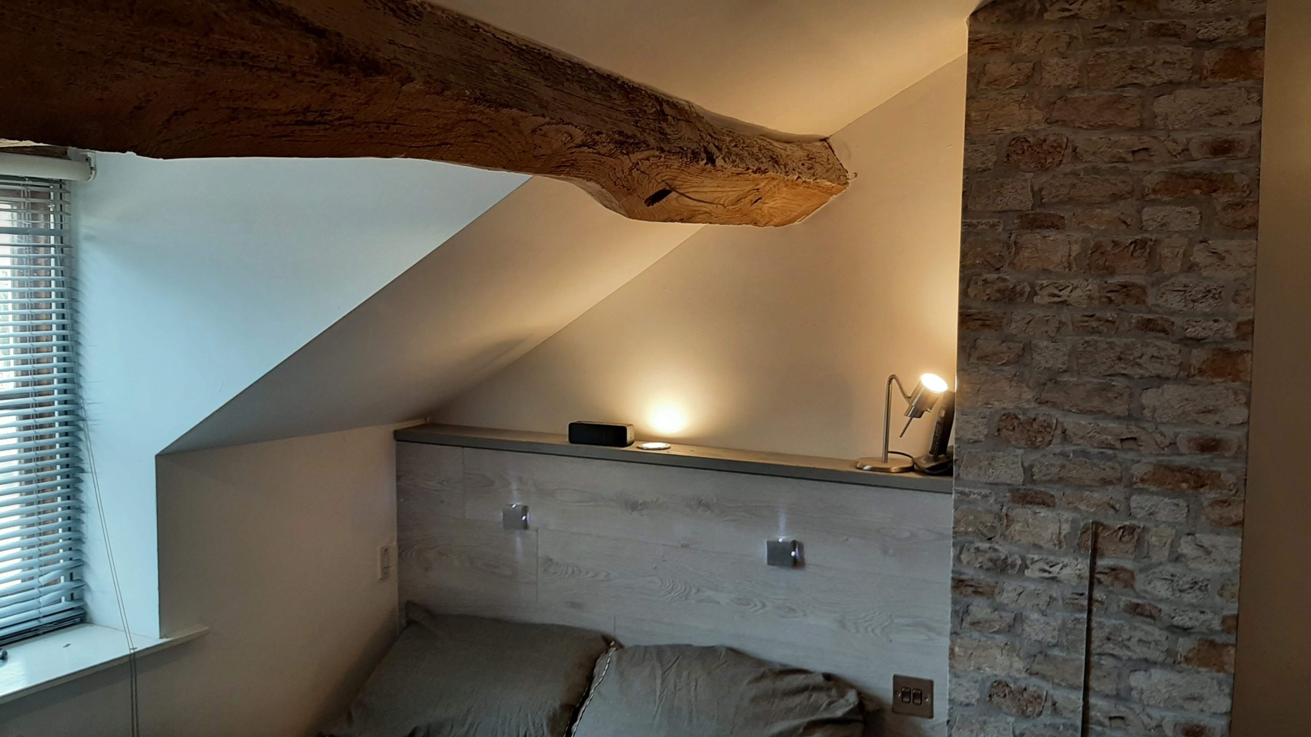Double Bedroom two 13′ long by approximately 10 feet wide (Reducing the head height again) double aspect with dormer window to Sheep Street and a window to the side of the property at Darlingscote Road. two radiators, fine exposed roof timbers and cupboard (used as an airing cupboard) storage shelving and spotlights.