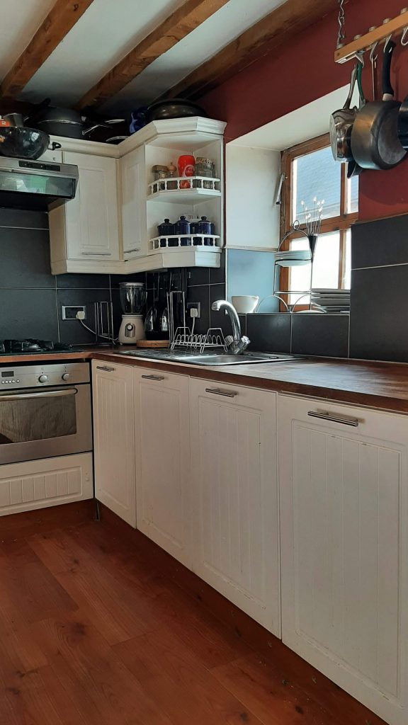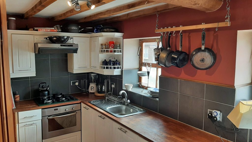 Kitchen dining room L-shaped 11′ ft (9.8m) x 6′ 11″ (2.1 m) and 6 ft 10 (2.1 m) and 5ft (1.55 m) Kitchen area having two windows to front, exposed ceiling timbers. Containing a range of mid level base and wall cupboards and draw units with flush fitting Beech work surfaces with space and plumbing for dishwasher. Fitted oven, Laminate flooring, gas hob and under fit hood cover tiled snap backs/backs and display shelving to wall cupboards. Chimney breast feature to the dining area exposed ceiling timbers recessed above.