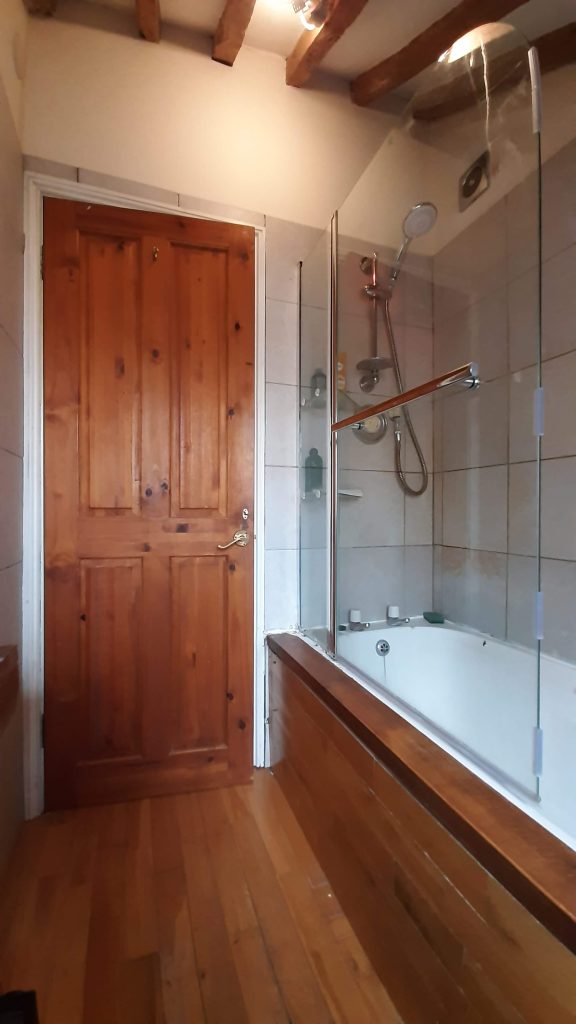 Double Bedroom one 15’9″ x 9′ ft Reducing head height with exposed timbers, a dormer window overlooking the patio area at the back of the property.Central heating radiator and inbuilt large wardrobe and storage area above with hanging rails